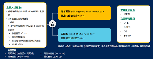 达尔西利(Dalpiciclib)是AG庄闲医药自主研发的口服、选择性的小分子CDK4/6抑制剂,也是中国首个自主研发的新型高选择性 CDK4/6 抑制剂,已证实其与内分泌治疗(ET)联合用于 HR+/HER2- 晚期乳腺癌的一线和后线治疗时,均显著改善无进展生存期(PFS)6,7。因此开展了一项随机、双盲、III期临床试验(DAWNA-A),以进一步评估达尔西利联合内分泌治疗作为高危早期 HR+/HER2 - 乳腺癌辅助治疗的效果。本研究纳入高危复发风险人群需满足以下标准之一:①≥4 枚阳性腋窝淋巴结;②1–3枚阳性腋窝淋巴结且合并≥1 项高危因素(肿瘤直径 ≥5 cm,组织学分级3级,辅助治疗后残留浸润性乳腺癌,Ki-67 ≥30%)。本文呈现预先设定的首次中期分析(IA1)结果。